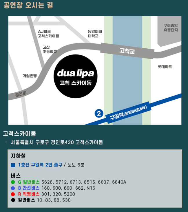 고척스카이돔은 서울 구로구에 위치한 대형 실내 공연장입니다. 대중교통을 이용하실 경우, 지하철 1호선과 7호선이 만나는 온수역에서 하차 후 도보로 10분 정도 걸립니다. 버스를 이용하실 경우, 고척동 주민센터나 고척스카이돔 앞에서 하차하시면 됩니다.