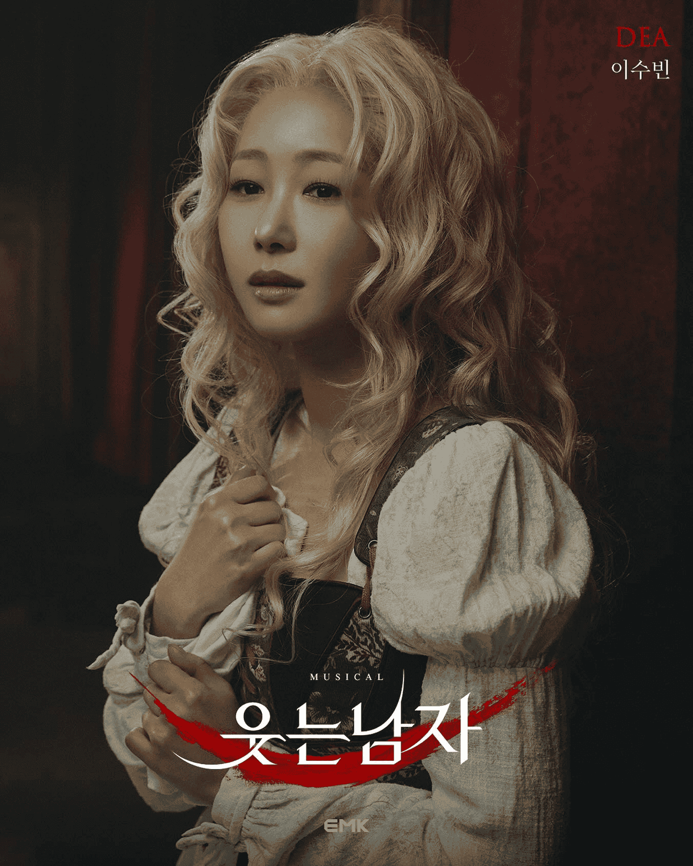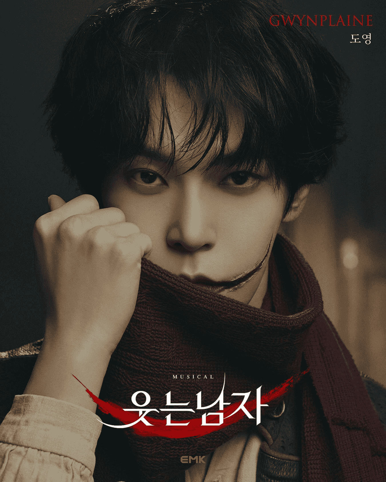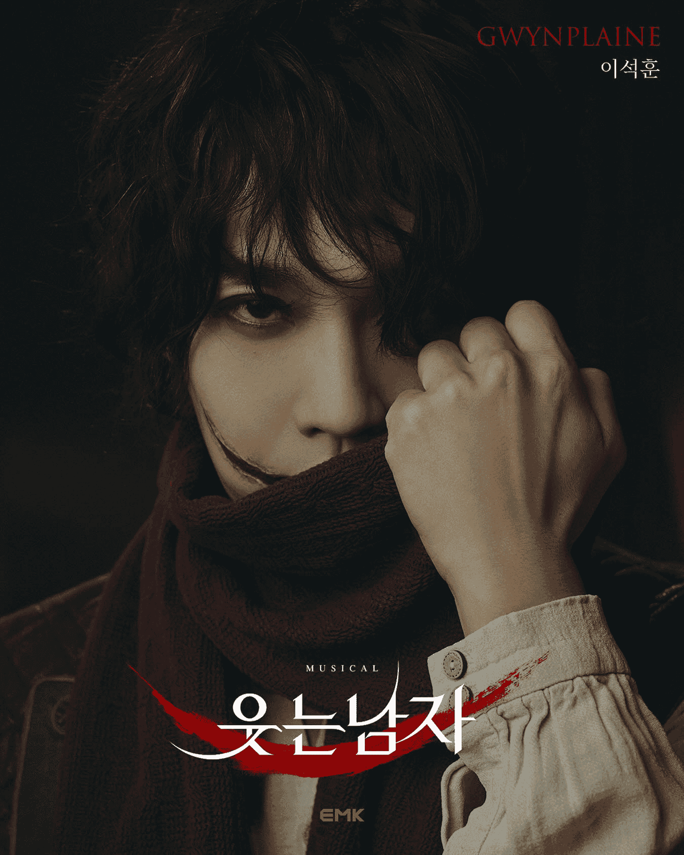 시간의 흐름으로 빛이 바래고 찢긴 포스터 속에서, 그윈플렌의 상징인 찢긴 입을 표현한 선명한 붉은색 로고가 시선을 사로잡습니다. 작품의 시대적 배경과 정체성을 오롯이 담아낸 포스터입니다.
