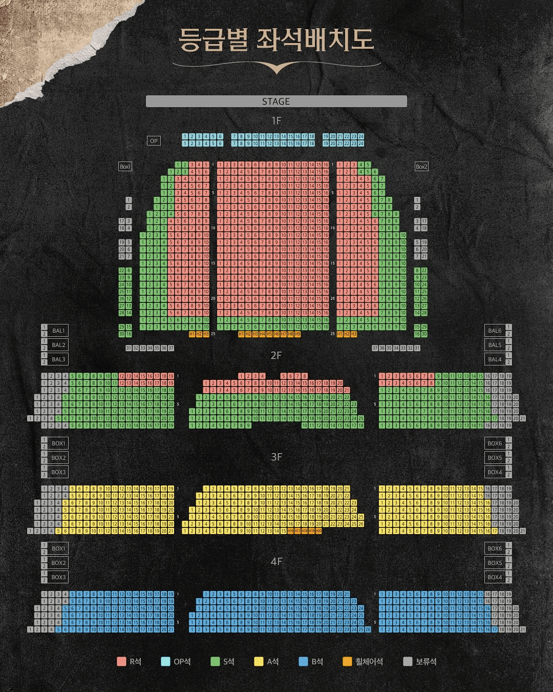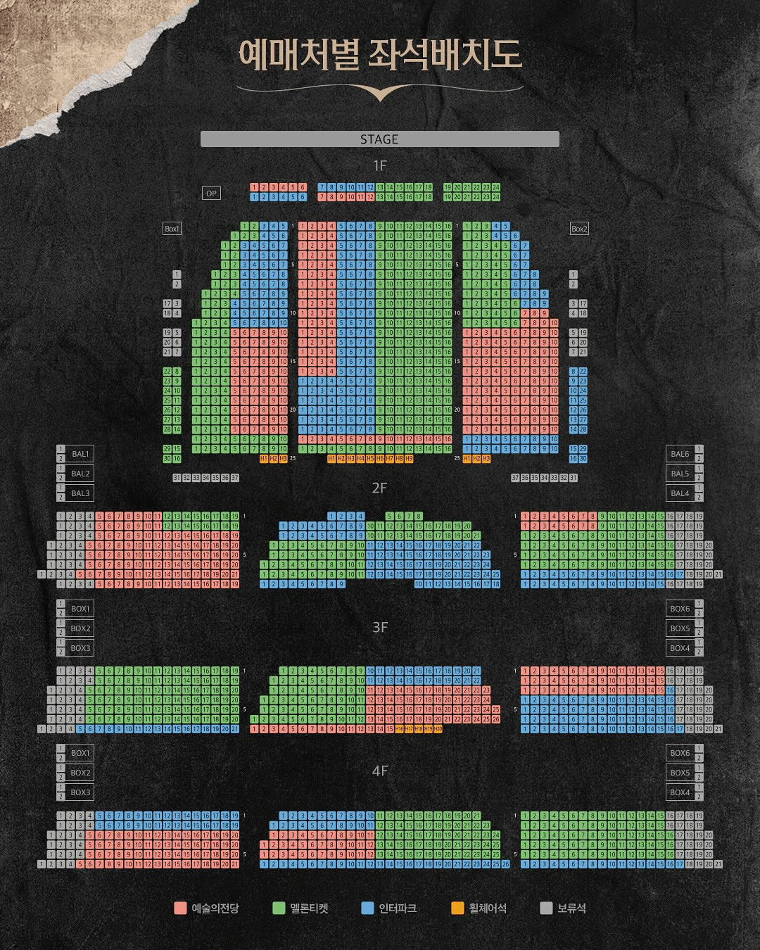 - 객석 2층, 3층, 4층 앞쪽에는 관객분들의 안전을 위하여 난간이 설치되어 있어 시야 제한이 발생할 수 있습니다. 이로 인한 좌석 변경, 환불 및 취소는 불가하니 예매 시 유의하시기 바랍니다.