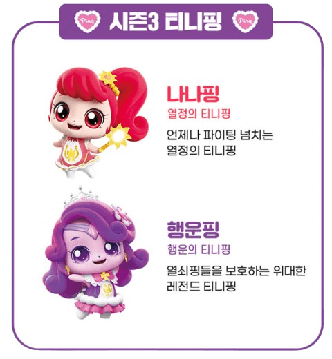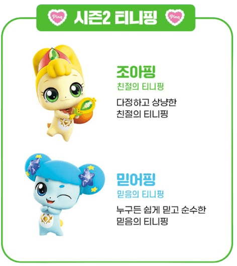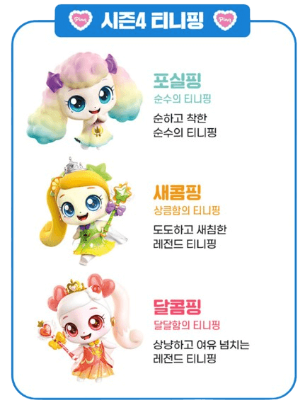 - 포실핑, 새콤핑, 달콤핑: 각각 순수, 상큼함, 달달함을 대표하는 매력적인 티니핑들