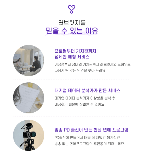 러브릿지는 방송이 없는 진짜 '연애프로그램'입니다. TV 카메라도, 각본도 없답니다. 그저 비슷한 분들이 모여 자연스럽게 대화하고 서로를 알아가는 시간을 가질 뿐이죠. 1박 2일 동안 아름다운 장소에서 특별한 인연을 만나보는 건 어떨까요?